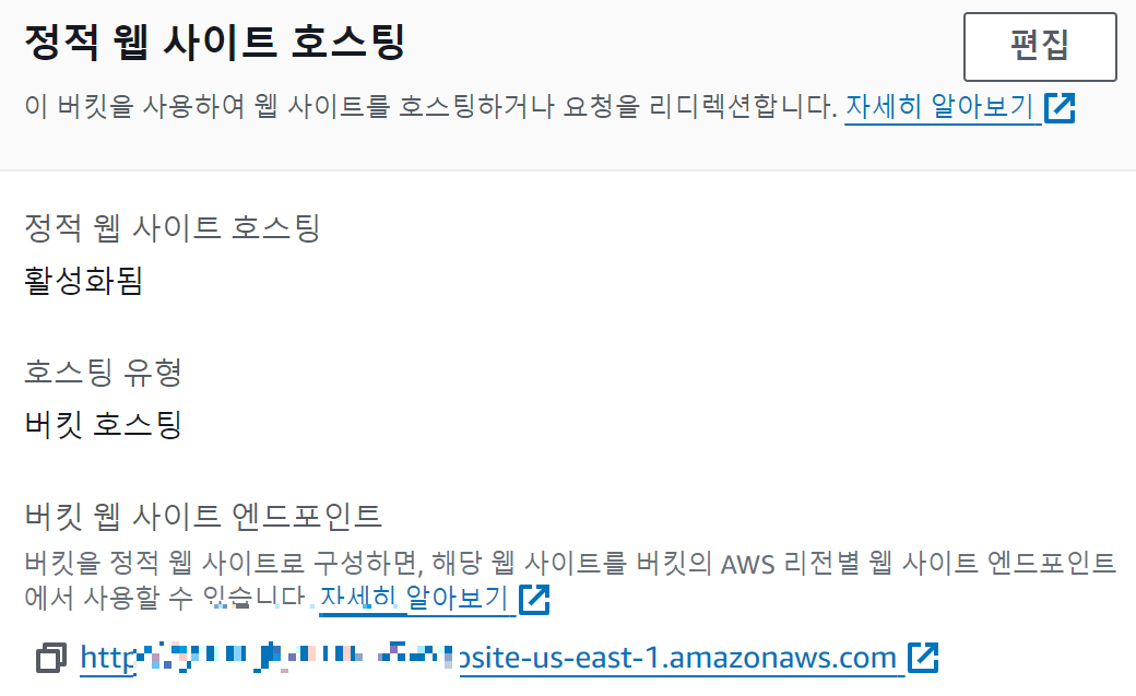 루트 도메인 버킷에서 아래 사진과 같이 정적 웹 사이트 호스팅을 구성합니다.