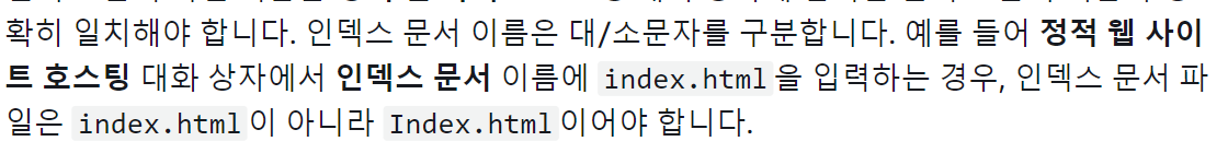 documentation에는 기계 번역 오류가 있는데 정적 웹 사이트 호스팅 대화 상자에 index.html을 입력한 경우 버킷에 업로드할 이름은 Index.html이 아닌 index.html이 맞습니다.