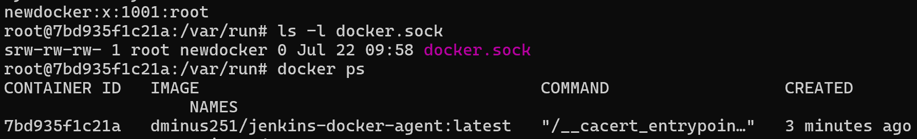 agent { docker { image 'dminus251/gardle-agent:latest' args '--privileged -v /var/run/docker.sock:/var/run/docker.sock' #추가 label 'docker-cloud-agent' } } - dminus251/jenkins-docker-agent:latest 컨테이너에 들어가 docker --version, docker ps 명령 수행