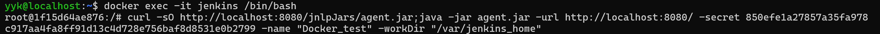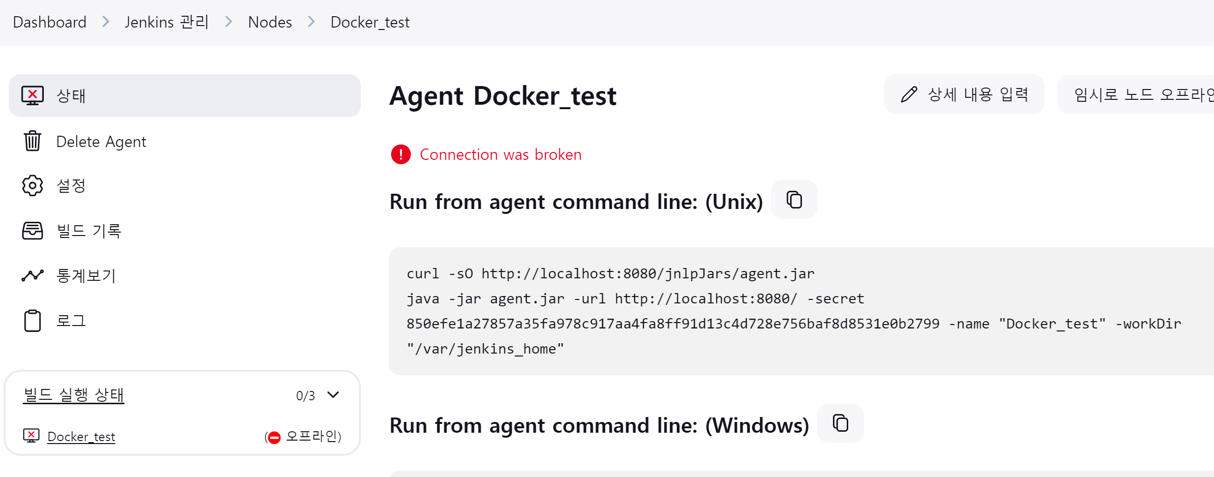 Jenkins 컨테이너에 들어가 위 사진의 Run from agent commind line을 복사 후 붙여넣기해서 에이전트 노드를 연결합니다.