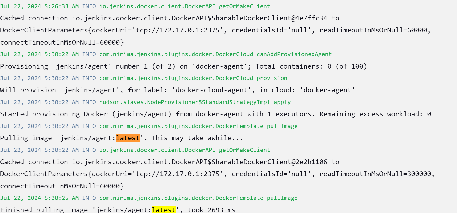 젠킨스 에이전트가 젠킨스 마스터 컨테이너에 영구적으로 연결된 상태로 유지됩니다. 에이전트가 한 번 설정되면 에이전트는 수동으로 조작하지 않는 한 계속해서 활성 상태로 유지됩니다. - 동적 프로비저닝 도커 에이전트 (Cloud)