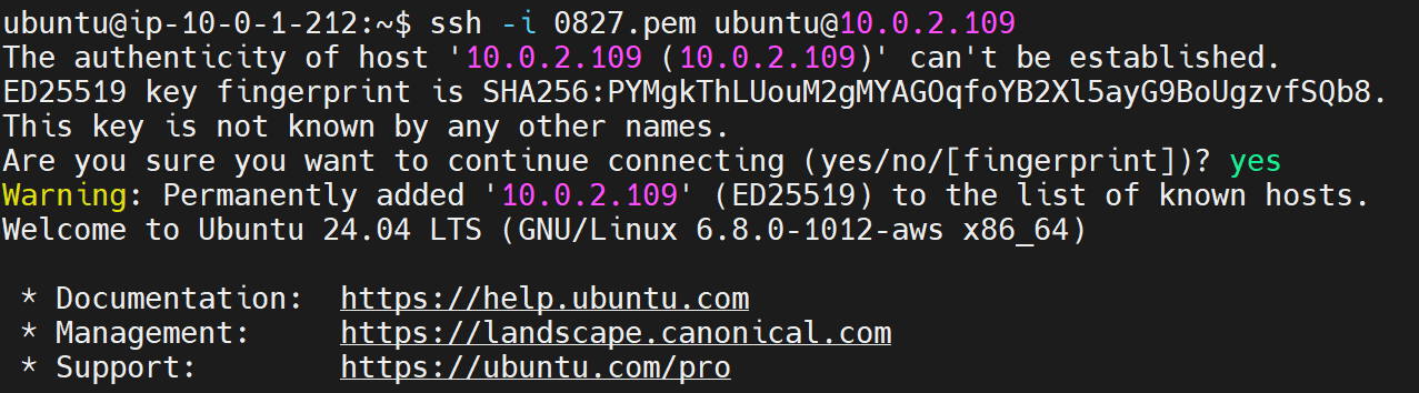이 인스턴스의 ip는 10.0.2.109/24고, 마찬가지로 ssh 연결에 성공했습니다.