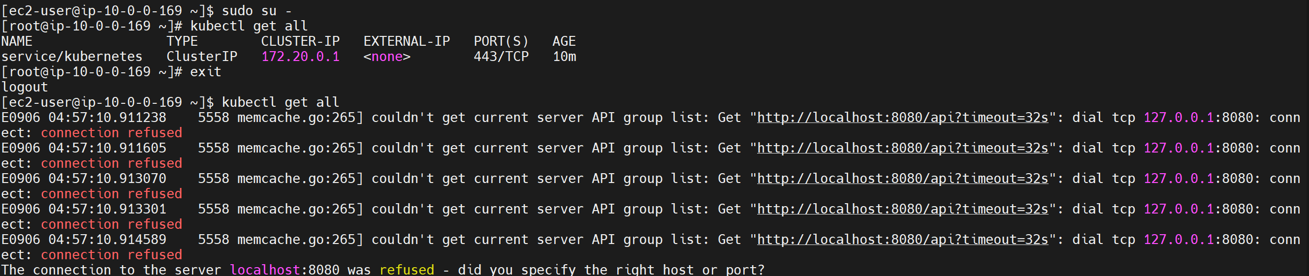 root 유저가 아니면 아래 사진처럼 클러스터에 접근할 수 없습니다.