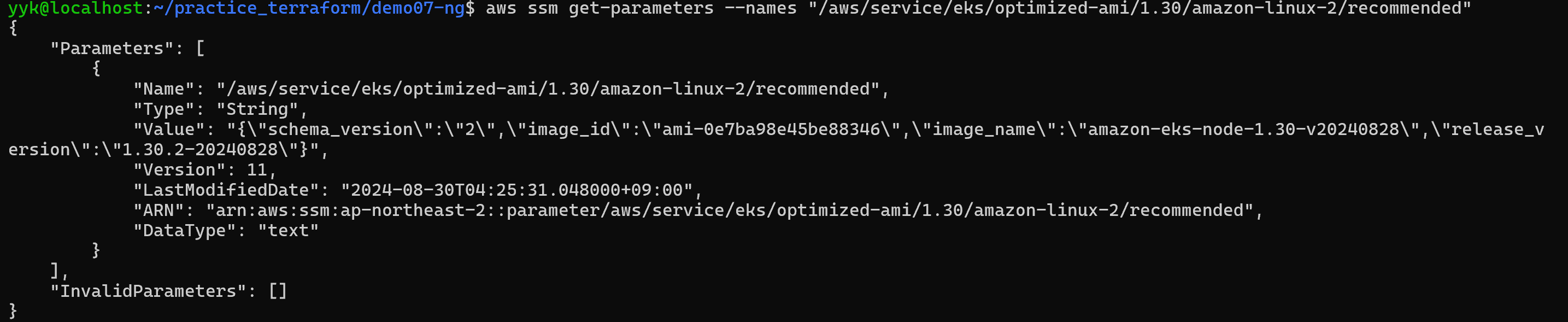 aws ssm get-parameter --name /aws/service/eks/optimized-ami/1.30/amazon-linux-2/x86_64/standard/recommended/image_id --region ap-northeast-2 --query "Parameter.Value" --output text