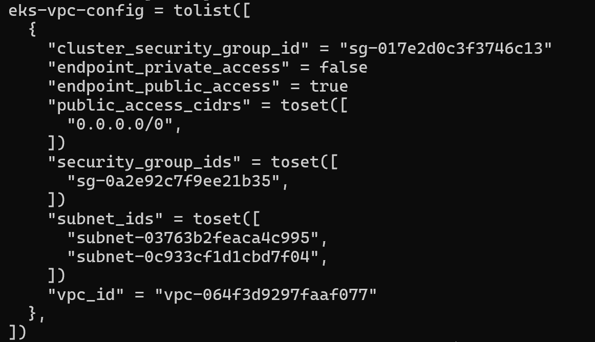 vpc_config는 리스트 형식으로 제공되기 때문에 [0] 인덱스로 참조해서 clsuter sg의 id를 output으로 내보냅니다.