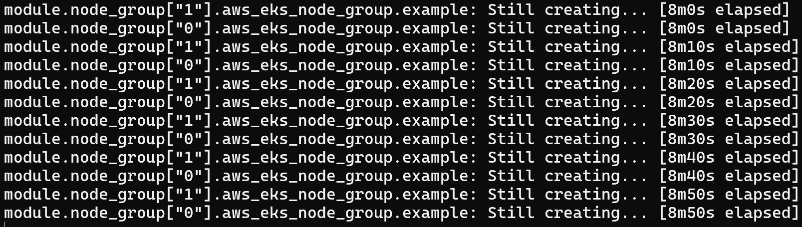 (이번 포스팅을 하면서 수십 차례 노드 그룹을 생성해본 결과, 정상적인 경우 4분 이내 노드 그룹 프로비저닝이 완료되고, 그이상 넘어가면 20분대에서 instances failed to join cluster 에러가 발생하며 terraform apply에 실패합니다.)