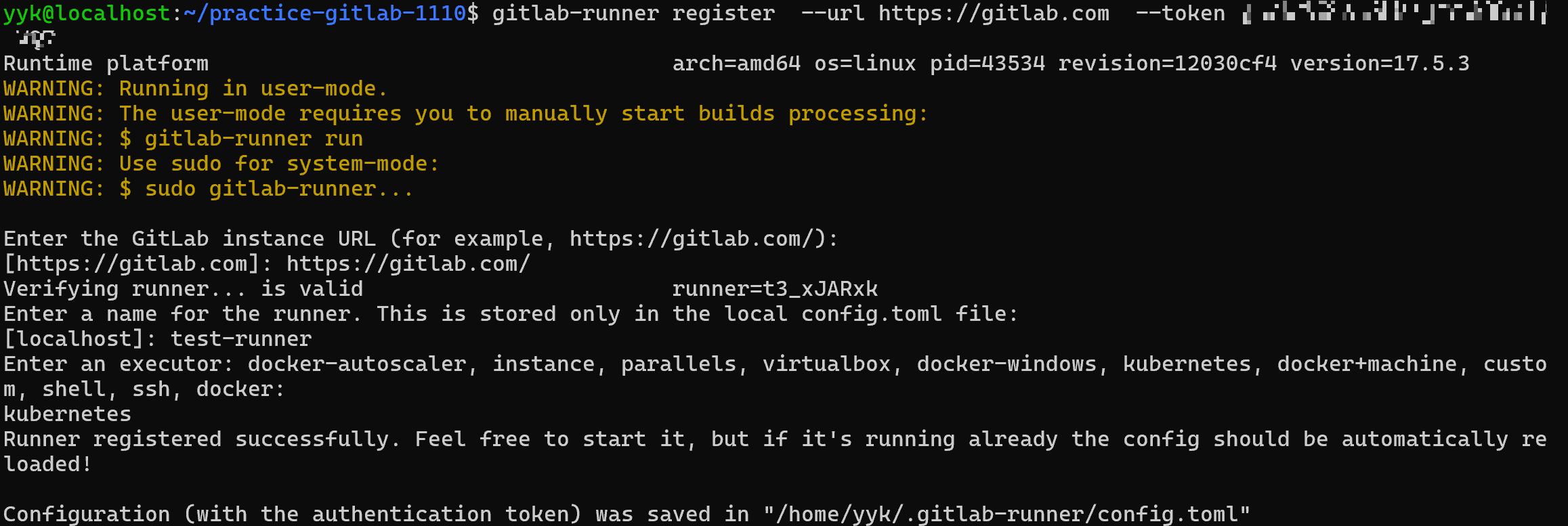 이제 저의 경우 gitlab-runner run 명령을 입력하면 웹사이트에 'You've registered a new runner!'라는 메시지가 보입니다.