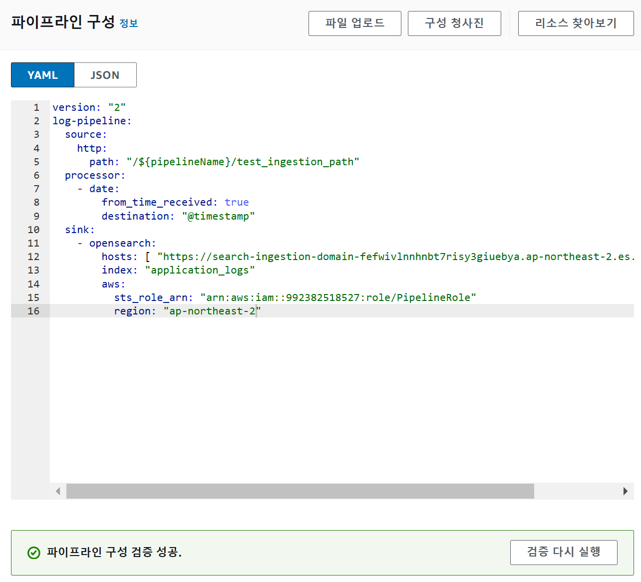 6. sink.opensearch에서 hosts와 aws를 각각 ingestion-domain의 URL과 PipelineRole의 ARN으로 변경하세요.