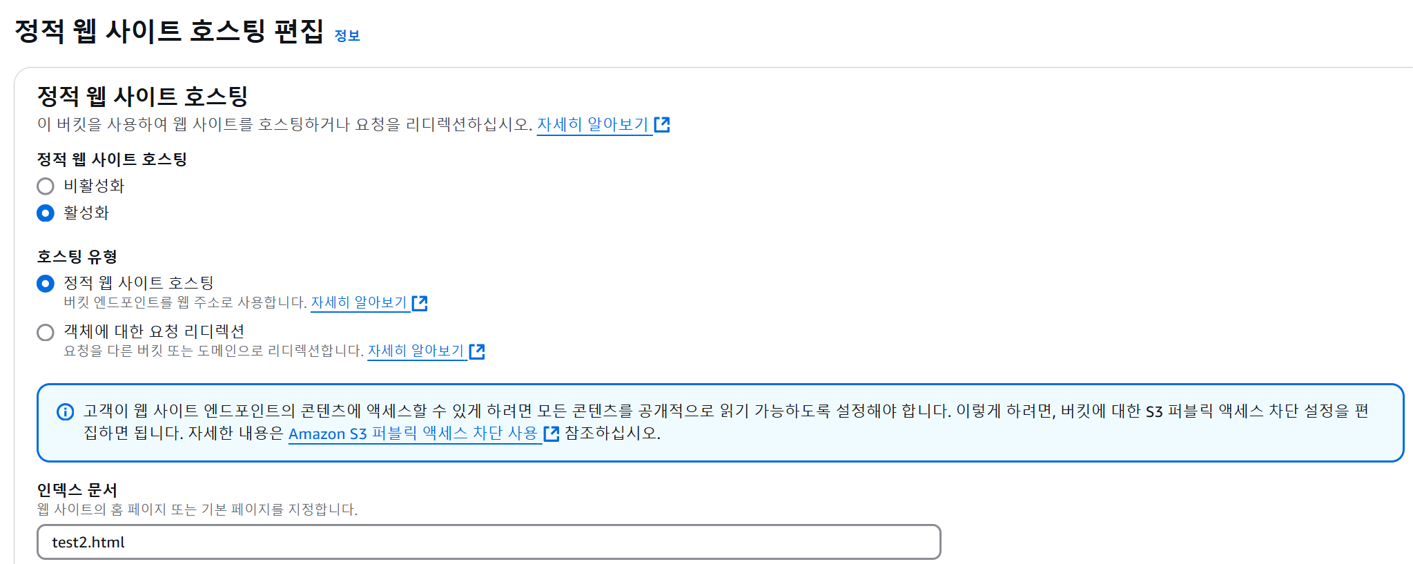 이제 버킷의 속성 -> 최하단 정적 웹 사이트 호스팅 편집에 들어가 test2.html 파일을 호스팅하도록 설정합니다.