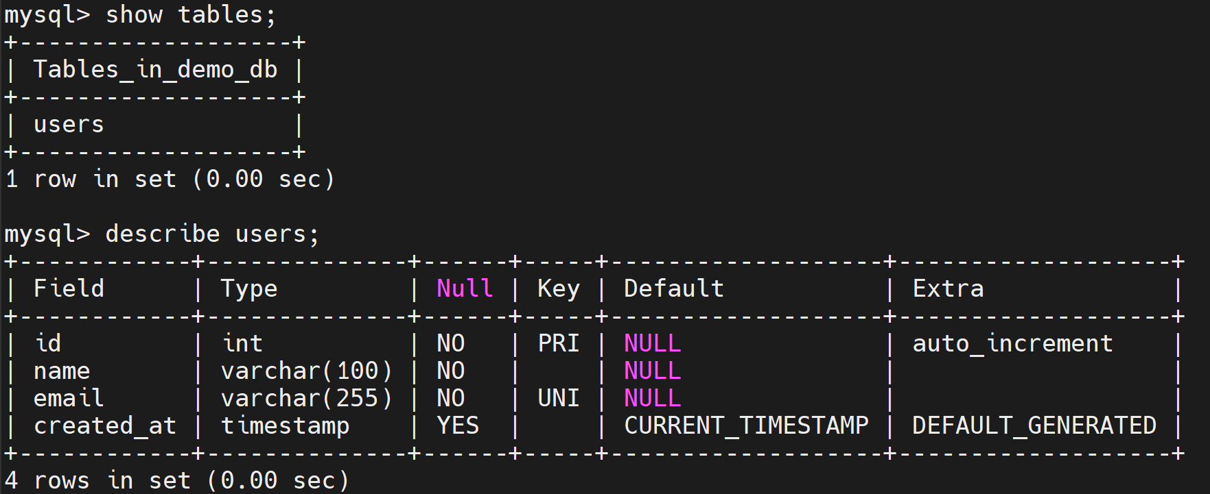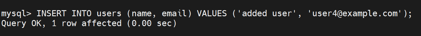 mysql> INSERT INTO users (name, email) VALUES