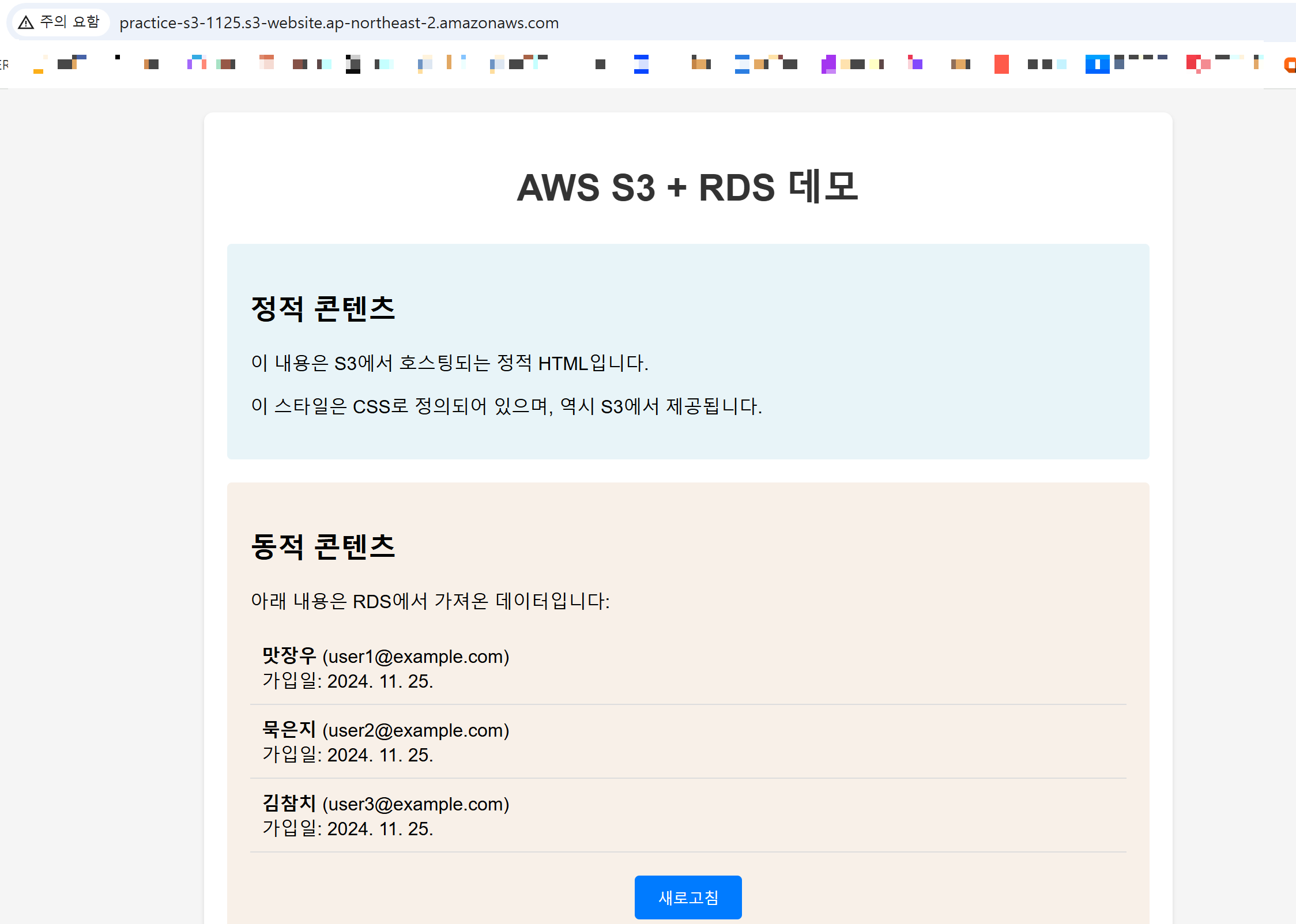 동적 콘텐츠를 잘 가져오는지 테스트하기 위해 RDS에 유저 정보를 하나 더 삽입합니다.
