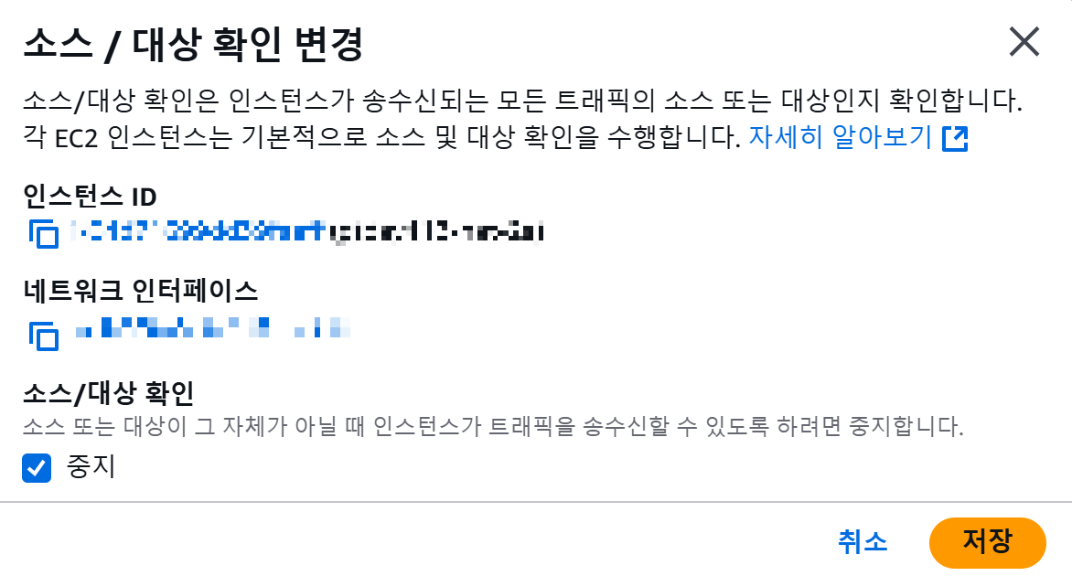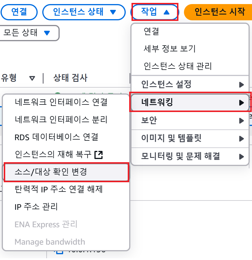 AWS 콘솔에서 NAT 인스턴스를 선택 후 작업 -> 네트워킹 -> 소스/대상 확인 변경을 클릭합니다.