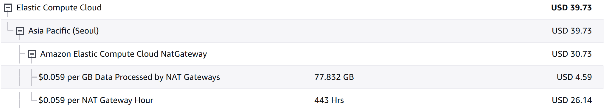 NAT Gateway의 사용료는 시간 당 $0.059이기 때문에 한 달 내내 사용 시 약 $42.5가 부과됩니다. (+ 트래픽에 따른 비용 청구)